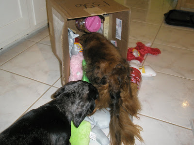 And here we thought you two spoiled Frankie Furter with that huge gox of gifts, but it looks like he returned the favor -what a great box of pressies. You two will have so much fun with all those stuffies.
